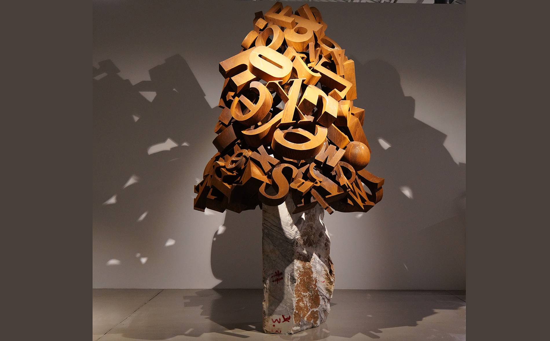 The realm of language is the artist’s sphere of practice in the works as a tribute to the banned fictional, imaginary universes and thoughts, extinct languages due to human intervention, and vulnerable and endangered languages. He superimposes graphemes (letters) onto phonemes (sounds) in the works with the letterforms. Relying on the notion that language is a complex living system, he investigates the complex issue of alphabet politics — the attempts by nations, cultures, and ideologies to ascribe a specific set of letters to a given language. The artist suggests that the alphabets are not just forms of language, they encompass cultures and voices they blossomed from.